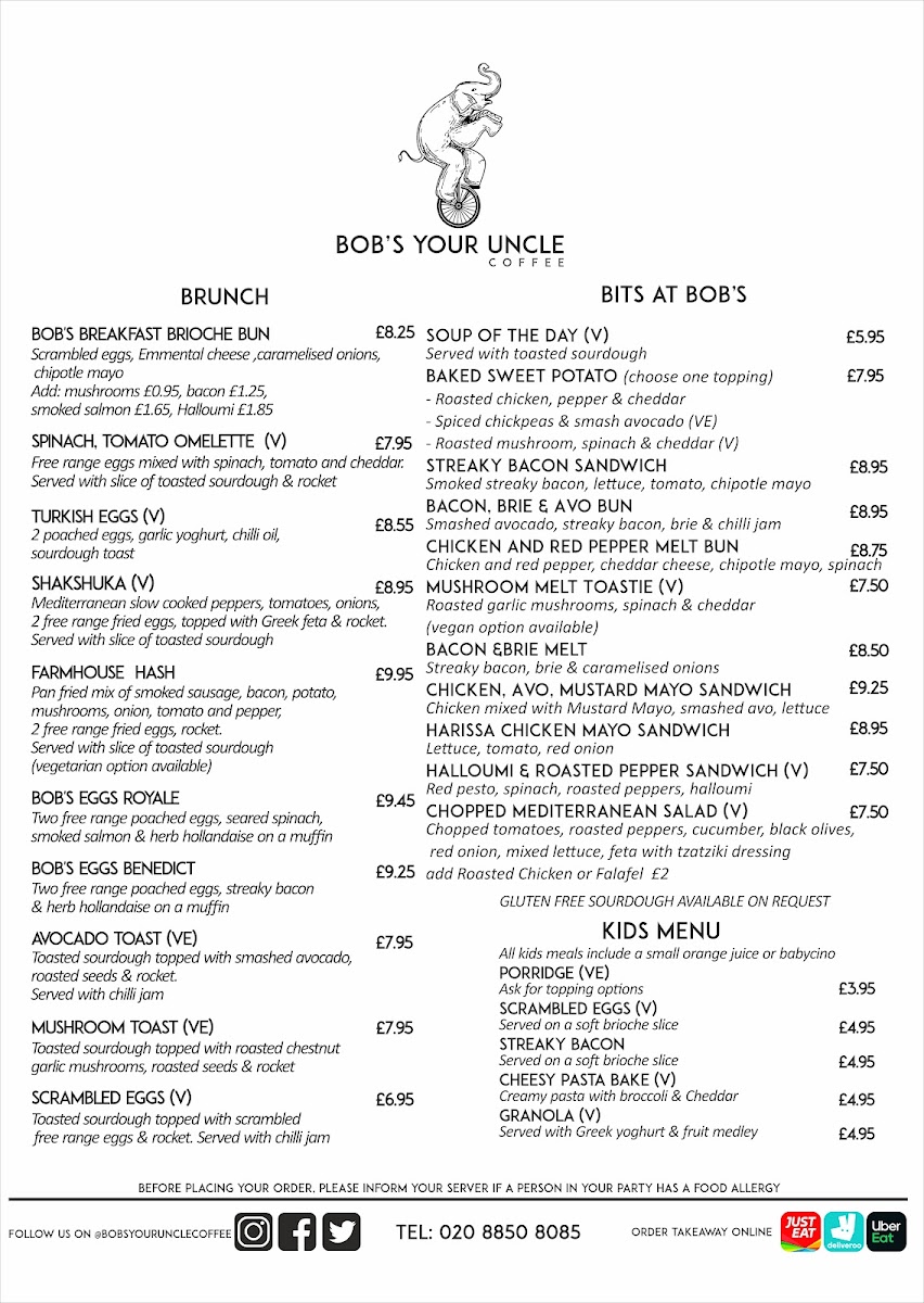 Welcome to Bob's Your Uncle, a delightful escape nestled in the heart of London at 7, St Mary's Place. This charming café offers an exceptional menu that celebrates fresh, quality ingredients tailored to satisfy diverse palates.